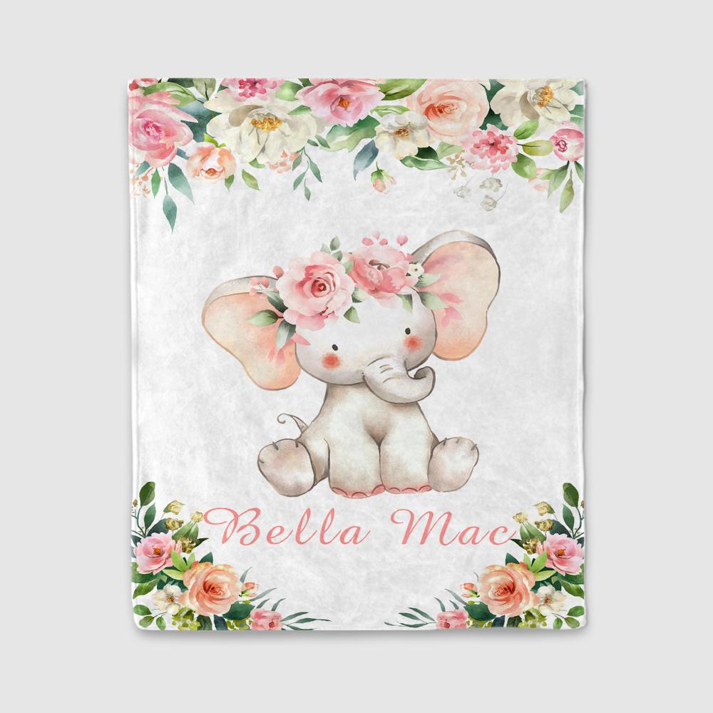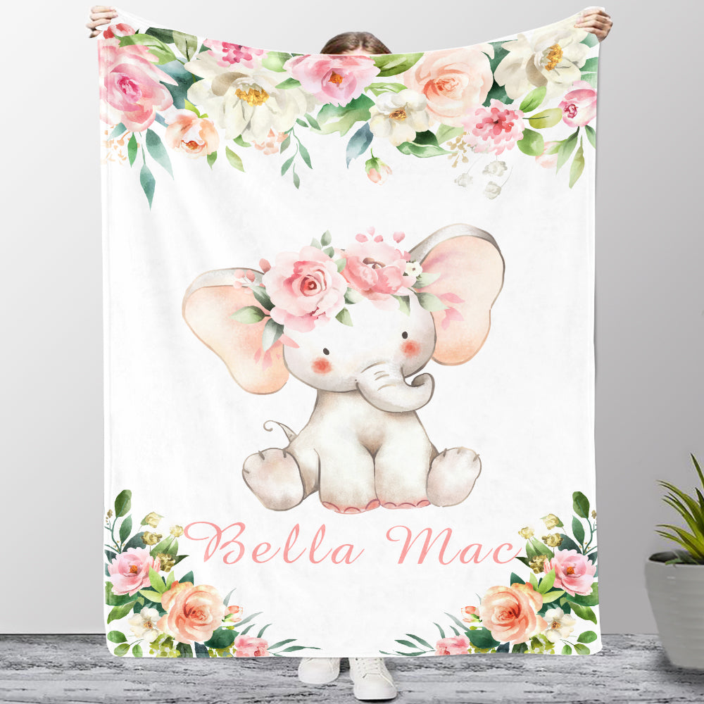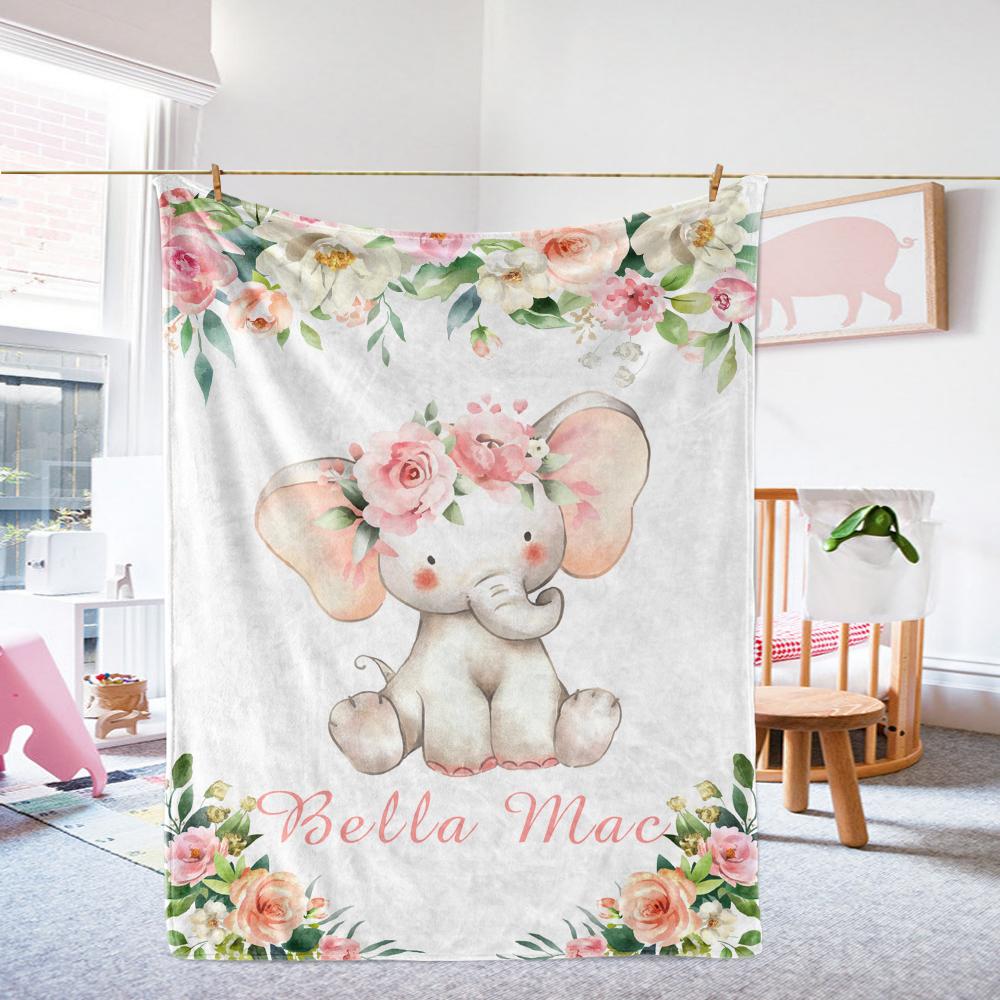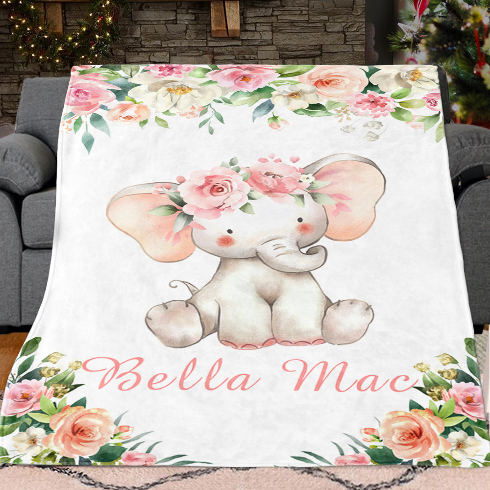 Home / Collections / BABY BLANKET / Custom Name Baby Elephant Fleece Blankets with Pink & White Flowers
