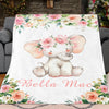 Custom Name Baby Elephant Fleece Blankets with Pink & White Flowers