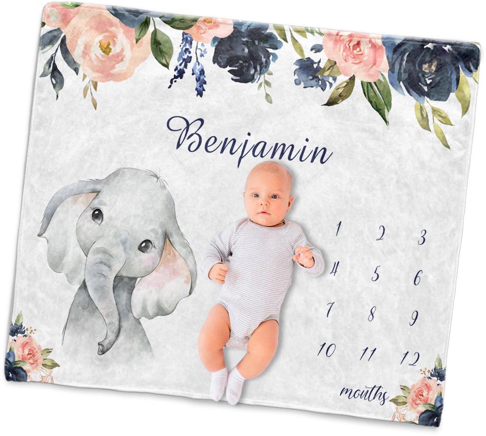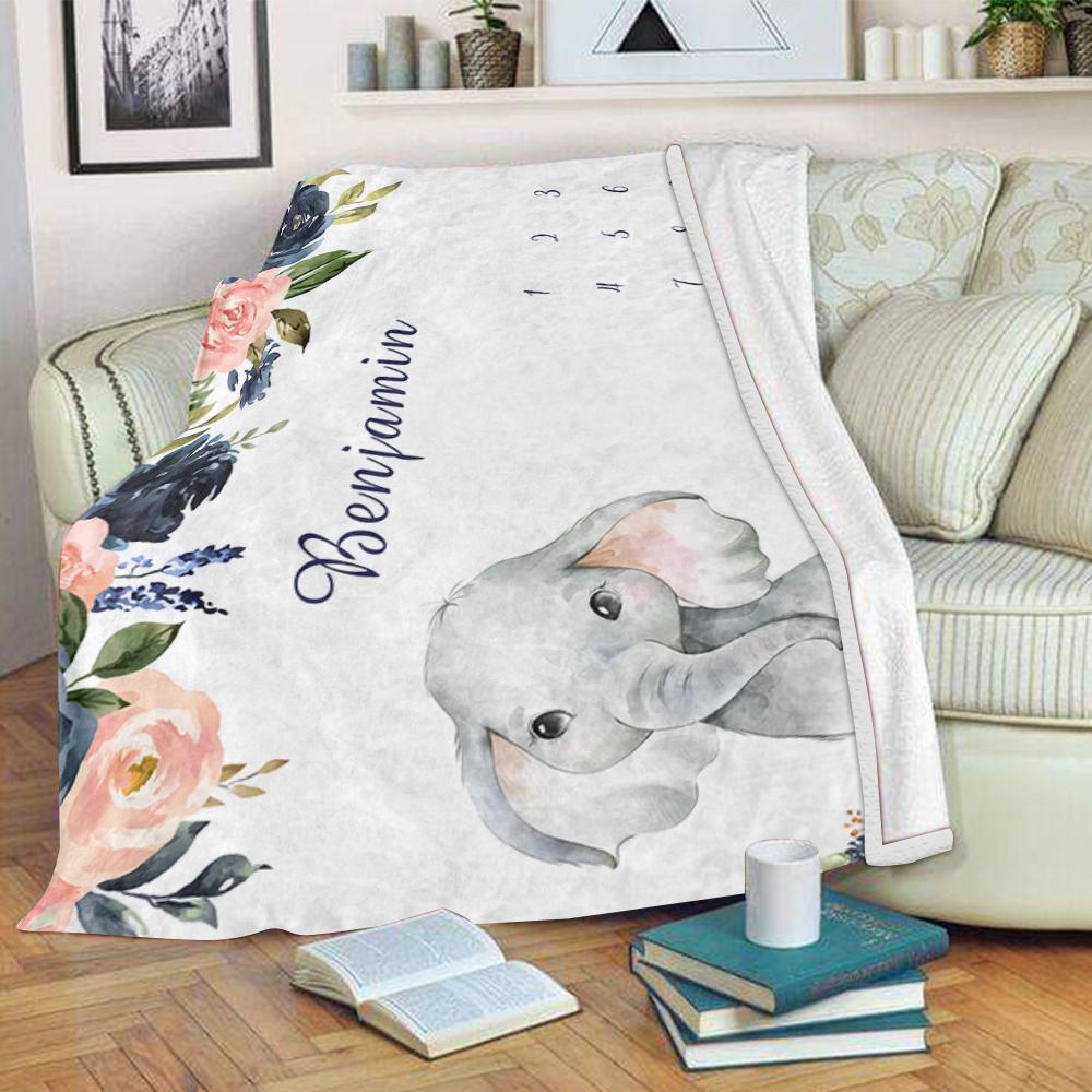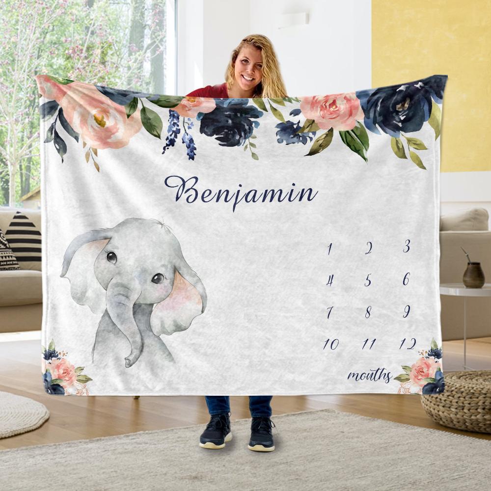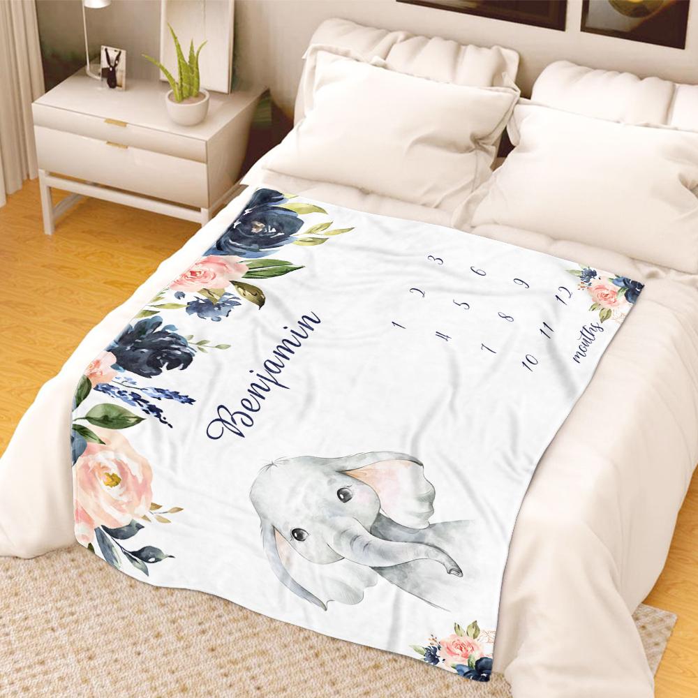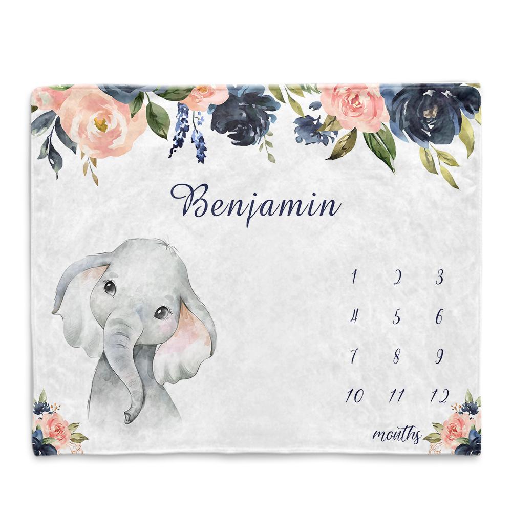 Personalized Name Baby Boy Elephant Fleece Blankets with Navy Flowers Milestone Blanket