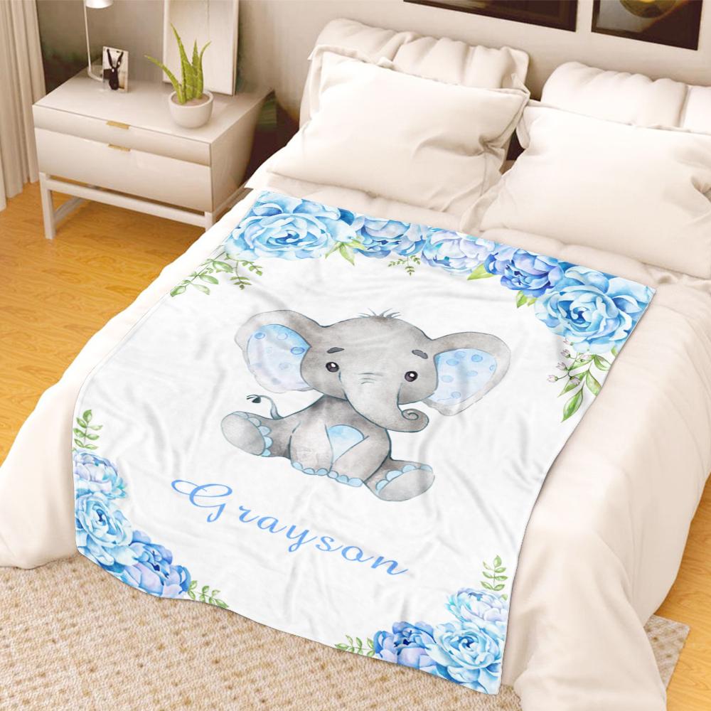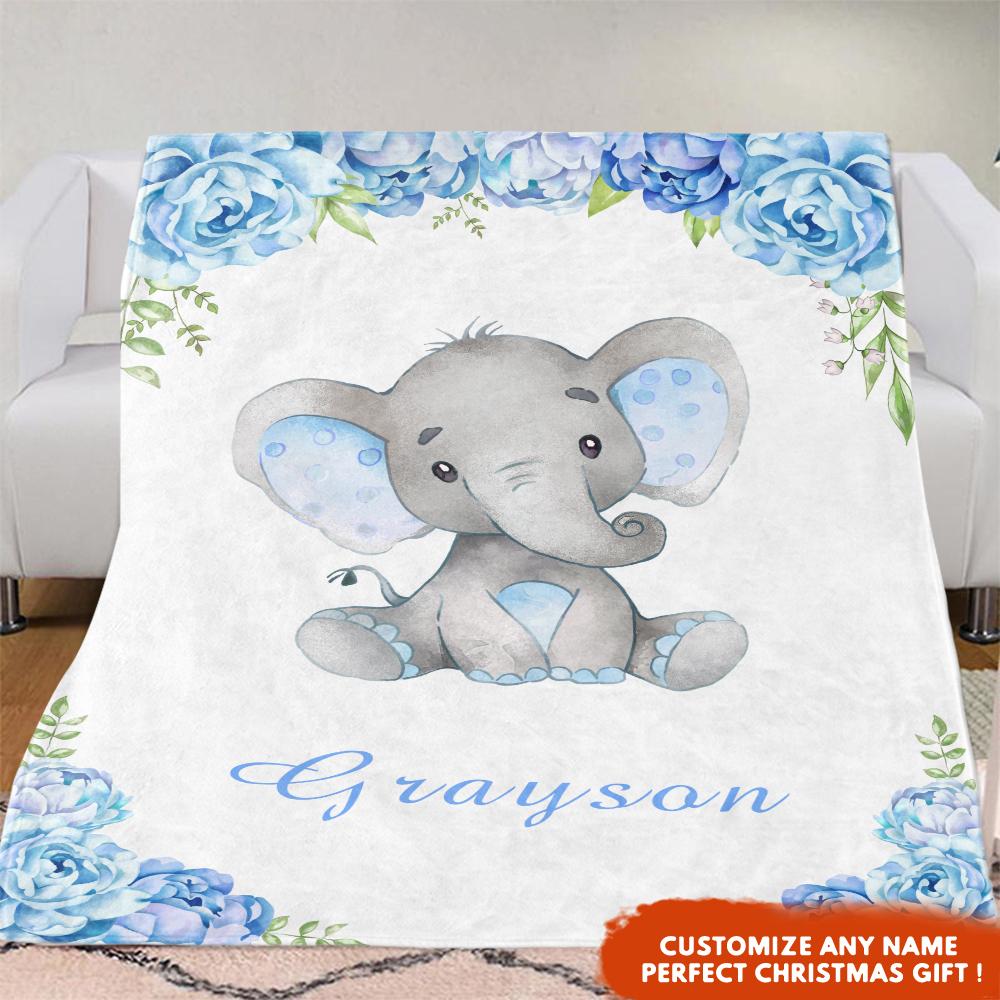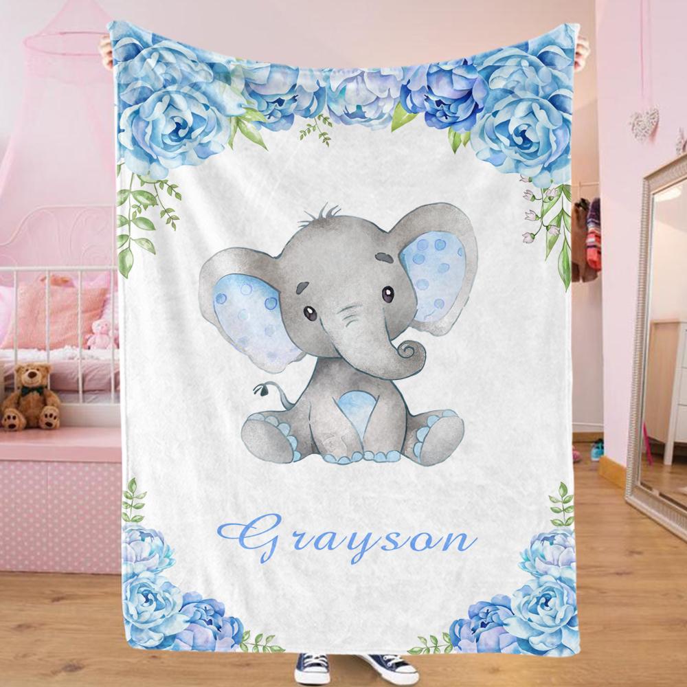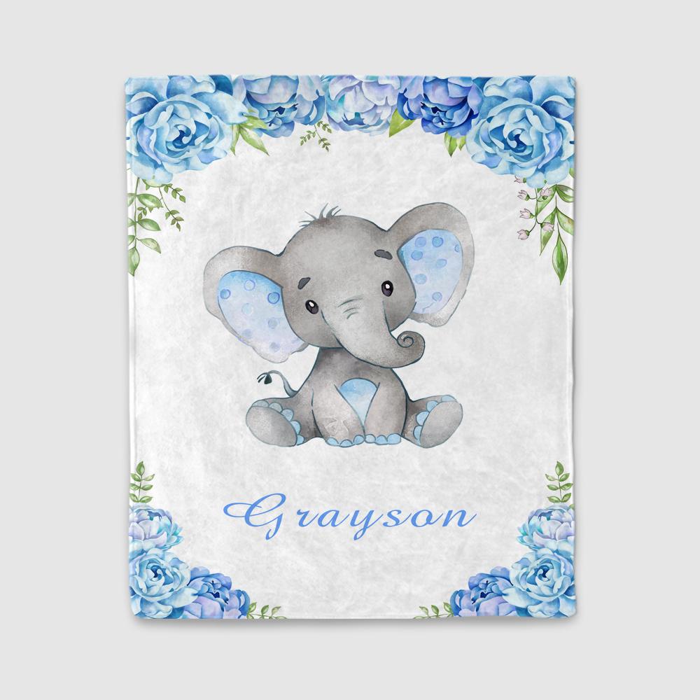 Home / Collections / BABY BLANKET / Personalized Name Baby Elephant Fleece Blankets with Blue Flowers