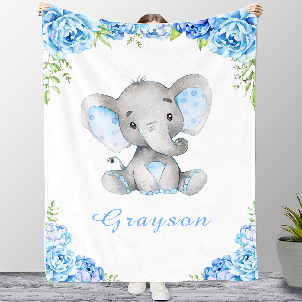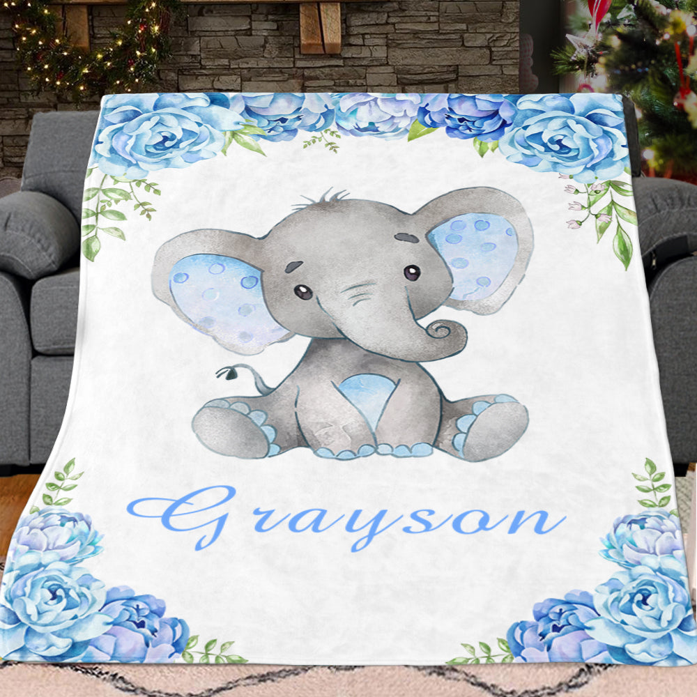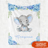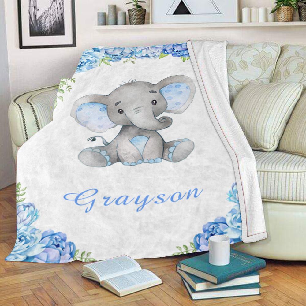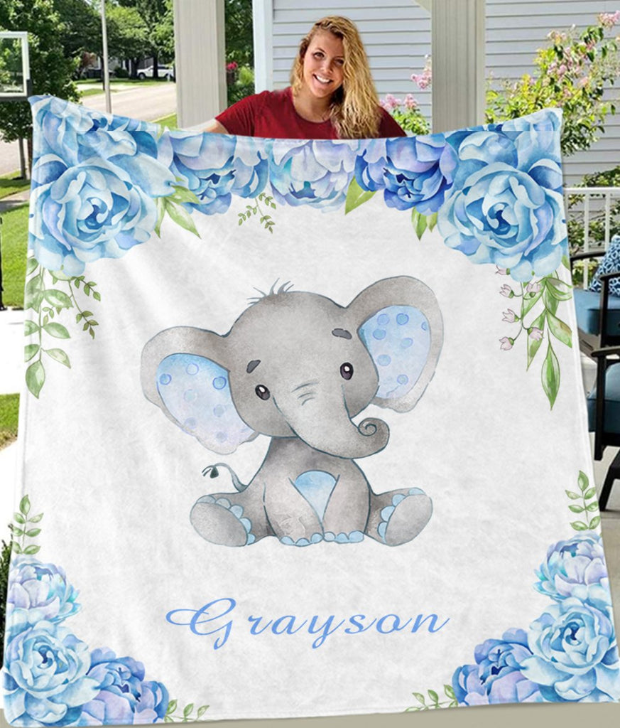 Home / Collections / BABY BLANKET / Personalized Name Baby Elephant Fleece Blankets with Blue Flowers