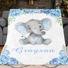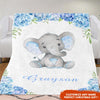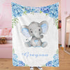 Personalized Name Baby Elephant Fleece Blankets with Blue Flowers