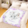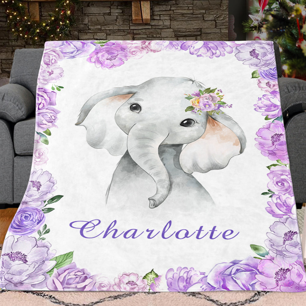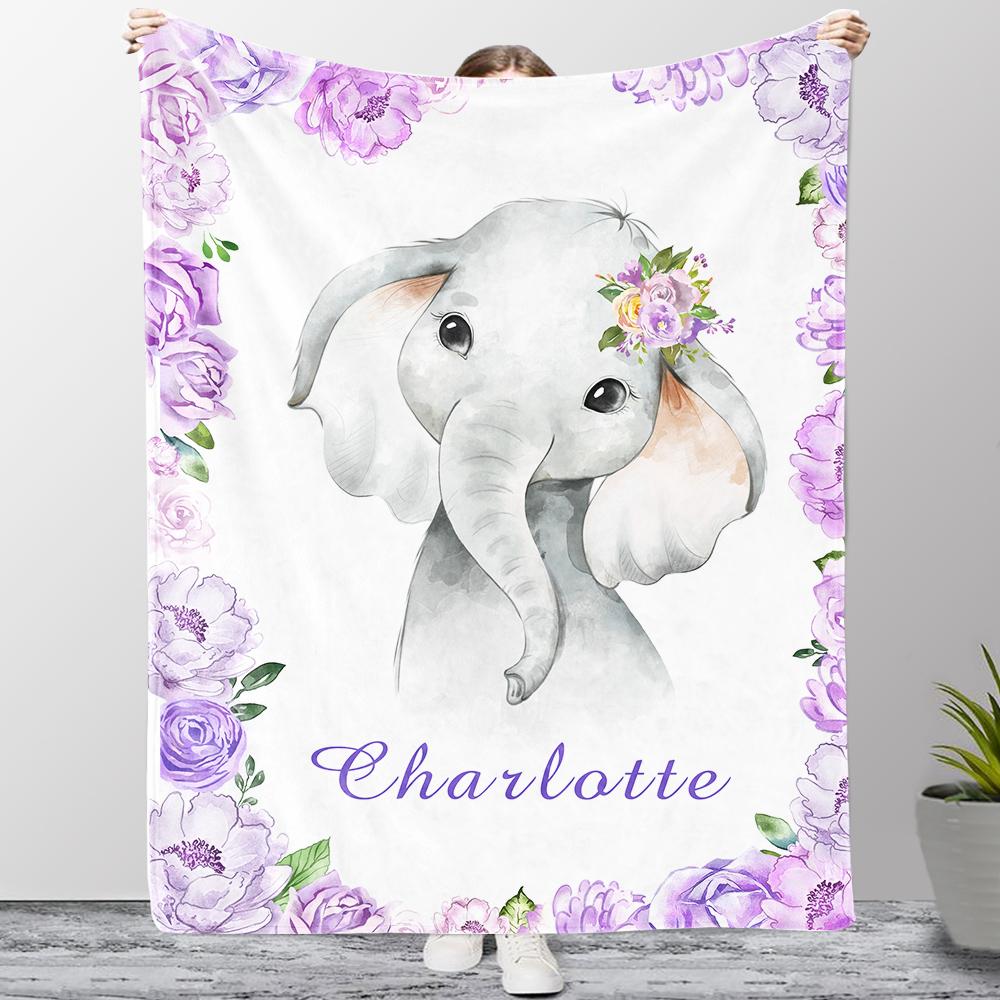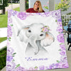 Personalized Name Baby Elephant Fleece Blankets with Pink Flowers