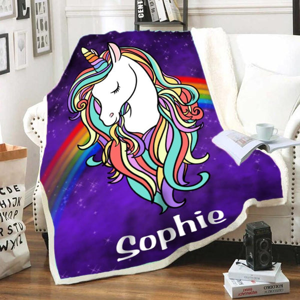 Custom Mermaid & Rainbow Unicorn Cozy Plush Fleece Blanket Purple